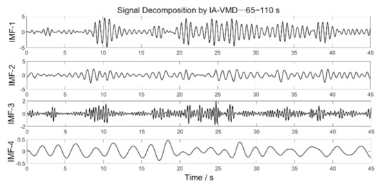 Similarly, the method proposed in this paper was used to address the ambient noise signal shown in Figure 7; the main mode signals extracted from the ambient signal by the first decomposition are shown in Figure 9. The signal energy method was used to screen the modes, and all the oscillation modes were retained finally. The decomposed signals were sorted into four dominant modes with decreasing amplitudes.