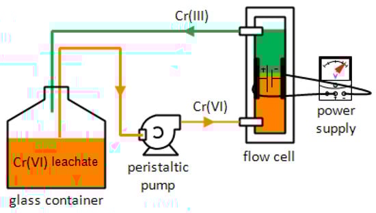 For the electrochemical treatment of Cr(VI) leachates both batch and batch-recirculation prototype reactors were used and constant current or voltage in the two-electrode setup was supplied by a DSC—ELECTRONICS, model DP60-15H, 60 V–15 A power supply.