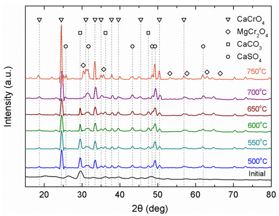According to the X-ray diffraction (XRD) spectra (Figure 2), in all thermally treated samples, the peaks related to the presence of chromium were attributed to the hexavalent form CaCrO4 (Joint Center for Powder Diffraction Studies—JCPDS card No. 08-0458), except for the samples treated at 750 °C, where the observed peaks were attributed to the trivalent form MgCr2O4 (JCPDS card No. 10-0351). It should be clarified that the identification of chromium’s form in the initial tannery sludge was not possible, due to the amorphous structure of these samples. Instead, the crystallinity increased after the thermal treatment, resulting in the appearance of sharp peaks. The remaining peaks of these spectra present mainly the CaCO3-calcite (JCPDS card No. 47-1743) and the anhydrous CaSO4 (JCPDS card No. 37-1496). The intensity of calcite peaks decreased as the treatment temperature increased, due to its decomposition, while in the case of anhydrite CaSO4, they remain almost unaffected in the examined temperature range.