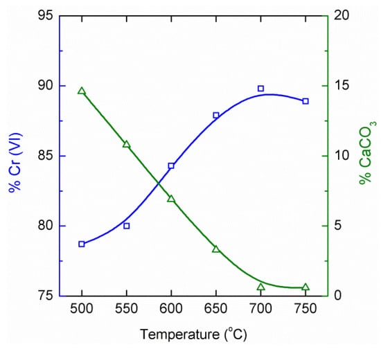 Furthermore, the presence of other metal oxides enhances the oxidation reaction [30]. As the chemical characterization of the sample has proven, the tannery sludge contained high amounts of calcium [31]. However, the dominant form in the sludge is CaCO3 and thus, in order for Reaction (3) to proceed, a prior step is required, namely Reaction (2). The decomposition of CaCO3 was essential and became possible in the temperature range examined [4]. The combination of Reactions (2) and (3) is considered to be the dominant oxidation mechanism, since the Cr(VI) is present in the thermally treated samples as CaCrO4, according to XRD spectra. In addition, the CaCO3 content in the corresponding ashes was inversely proportional to the determined Cr(VI) percentage up to 700 °C (Figure 3). A further increase in treatment temperature (e.g., over 750 °C) led to a partial reduction of Cr(VI) to Cr(II), since the more stable compound of MgCr2O4 was formed, due to the presence of MgO, according to Reaction (4) [32].