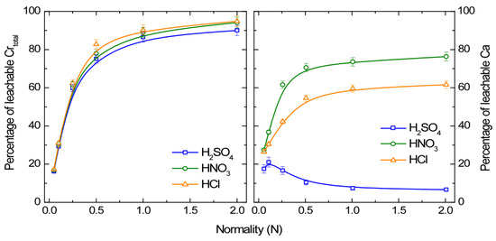 The leaching of chromium from the thermally treated samples was conducted according to the common hydrometallurgical protocols by examining various acidic agents. A given quantity of the solid was placed in a beaker and the leaching medium was added. The acids examined were HCl, HNO3 and H2SO4, in the concentration range 0.05–2 N. The rest of the experimental conditions remained constant, i.e., contact time 60 min, temperature 25 °C and liquid-to-solid ratio (L/S) equal to 25. After the extraction stage, the liquid phase separated by membrane filtration under vacuum and the major metal component concentrations (namely Cr and Ca) were determined in the filtrate.