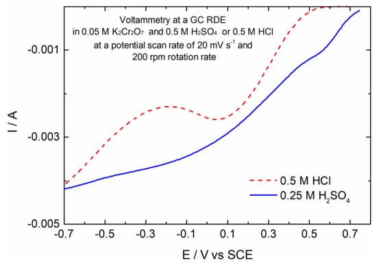 Figure 5 presents the linear sweep voltamograms (LSVs; current vs. potential curves recorded as the potential is varied at a 10 mV·s−1 potential scan rate), obtained with the use of a GC RDE (at a 200 rpm rotation speed) in a solution containing 0.05 M K2Cr2O7 in the presence of either 0.5 M HCl or 0.25 M H2SO4. Since Cr(VI) at pH <1 is known to exist mainly in its HCrO4− form [35], the negative currents correspond to the following electrochemical Reaction (5) [36].
