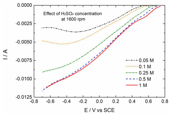 Current vs. potential LSV curves, recorded with a GC RDE electrode at 1600 rpm rotation speed and 20 mV·s−1 potential scan rate, in 0.05 M K2Cr2O7 solutions of varied H2SO4 concentrations.