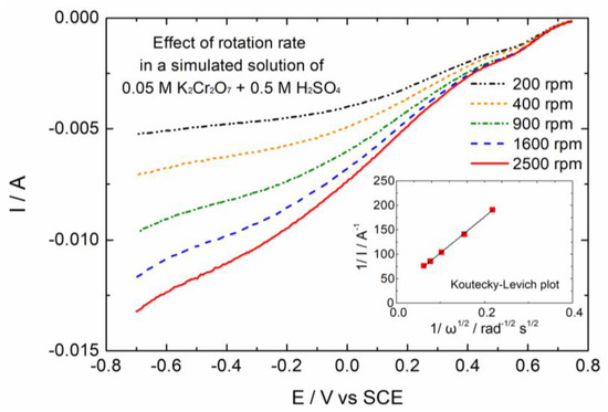 Current vs. potential LSV curves, recorded with GC RDE electrode at various rotation speeds (in the 200–2500 rpm range) and a 20 mV·s−1 potential scan rate, in a 0.05 M K2Cr2O7 + 0.5 M H2SO4 solution. Inset: Koyecky–Levich plot for currents at −0.6 V vs. KCl-saturated calomel reference electrode (SCE).