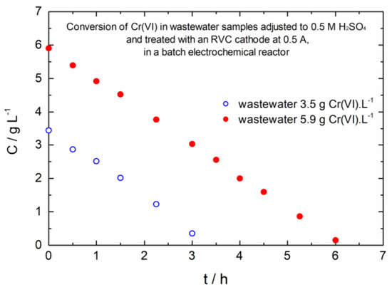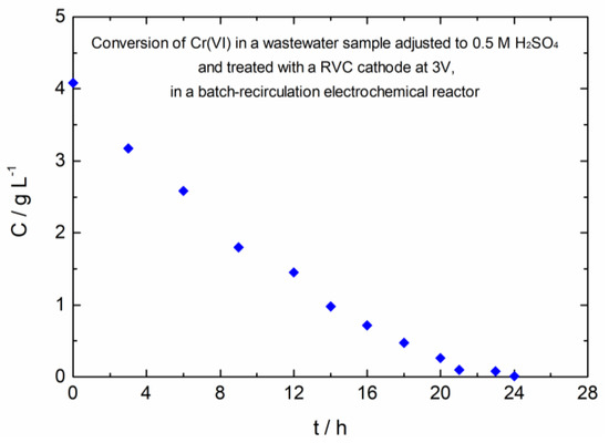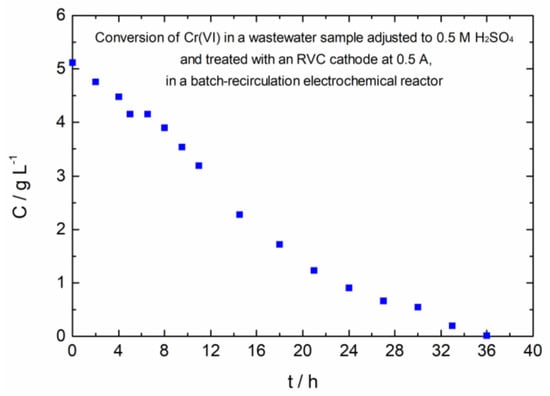Figure 9 presents the results of constant current electrolysis for 800 mL sample of leachate, containing 5.1 g Cr(VI)·L−1 in 0.5 M H2SO4 in the batch-recirculation reactor arrangement, described in the experimental section. The applied current was 0.5 A which, given the real area of RVC electrode embedded in the plate-and-frame electrochemical cell, corresponds to a cathode current density of ca. 1.25 mA·cm−2. The shape of the concentration vs. time curves points now to more complicated kinetics (as a plot of lnC/Co was not found linear). At the relatively lower flow rates used (33 L·min−1), the mass transport limitations are likely to prevail. This is also in line with the overall current efficiency of the process, which is now estimated as only 35%. As the concentration of Cr(VI) in the bulk solution decreases and the mass transport is not sufficient to sustain a full monolayer of adsorbed HCrO4−, a competitive reduction process (based on dissolved oxygen reduction, or hydrogen evolution) becomes operative to keep the current constant. The conversion of the Cr(VI) contained in 800 mL of a 5.1 g Cr(VI)·L−1 wastewater was 99.8% in 36 h.