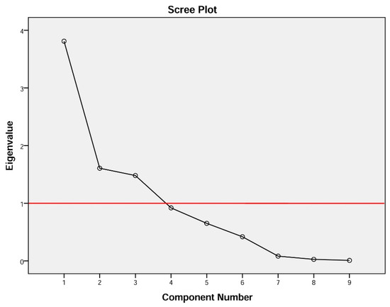 The eigenvalue versus the number of factors (The black line represents the eigenvalues of each factor and the red one shows the eigenvalues equal to or greater than 1).