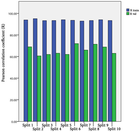 The 10-fold cross validation approach was efficiently used to assess the predictive capacity of the proposed model. We must stress out the fact that previous studies interested in estimating Cs [20,22,23,24] have evaluated the predictive capacity of their proposed models depending on a single split. Subsequently, the capacity of their models in overcoming the over-fitting and under-fitting problems could not be ascertained. Figure 6 shows the performance measures of the best FS-RF models using 10-fold cross validation depending on training and validation data for each split. The findings prove the performance of the proposed model. The fact that R ranges between 0.92 and 0.94 for training data, and between 0.62 and 0.75 for validation data in the 10 splits, indicates the predictive capacity of the most appropriate FS-RF model for learning data, generating new validation data, and overcoming the over-fitting or under-fitting problems.