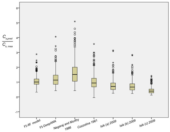In order to test the effectiveness of the most appropriate FS-RF model, a comparative study was performed with some empirical formulae suggested by the previous studies for predicting Cs. These formulae were presented in Table 1. Table 11 illustrates the statistical results of for aforementioned empirical equations in comparison with the proposed FS-RF and FS-DNN models. The mean and standard deviation of the ratio could be useful evidence for evaluating the predictive capacity. The closer the mean value to one and the standard deviation to zero, the better is the model. The results show that the most appropriate FS-RF model is the one with the minimum standard deviation σFS-RF = 0.25, in addition to being the closer mean value to 1 average(FS-RF) = 1.07. The other equations indicate a poor predictive capacity, yielding a mean value in the range of 0.45–1.7, and standard deviation value between 0.26–0.99. Equally, the box plot of of aforementioned formulae is displayed in Figure 7. This graphical representation provides an overview of the dispersion and skewness of every model. The scattering of the most appropriate FS-RF model appears only to be slightly regular and close to one, and is described by a shorter box than the others. The large box distant from 1, increasing to five in certain models, shows little variation in predicting Cs. Data characterized by circles and stars in the figure denote the extreme and extra-extreme value.