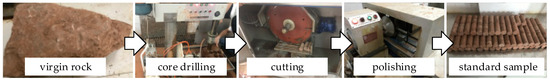 The rock used in the test was from a foundation pit project in Changsha. The main mineral composition was calcite, quartz, and sericite, as well as a small amount of kaolinite and montmorillonite. The average density was 2350 kg/m3 and the uniaxial compressive strength was 27 MPa. All samples were taken from the same intact block.