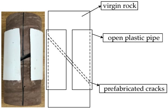 The mechanical experiments of grouted rock with unidirectional through cracks can reflect the reinforcement effect and the process of crack re-expansion at the location where the local cracks are not well developed. In the part where the cracks develop, the specimens with a bi-directional penetrating crack can better reflect the actual situation. To our knowledge, research on the compressive behavior of grouted rock with a bi-directional penetrating crack is rare. Zhibin et al. [23] analyzed fracture properties of grouted rock with bi-directional penetrating crack (as shown in Figure 2) under uniaxial compression. In Zhibin’s research, the angle between crack and principal stress and crack width were not considered.