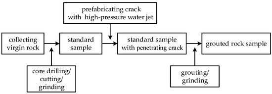 The sample preparation was divided into four steps: first, standard rock sample was made and the penetrating crack was processed, then the crack was filled, and finally the sample was polished again. The standard sample was a cylinder with a diameter of 50 mm and a height of 100 mm, and the crack was cut by high-pressure water jet. The production process of standard samples is shown in Figure 3. The crack width was controlled by open pipe to fix the spacing, which is shown in Figure 4. The sample production flow chart is shown in Figure 5.