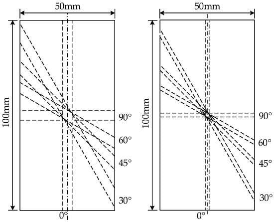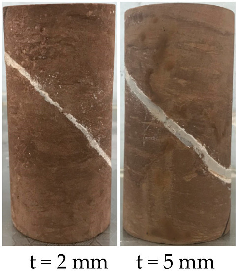 In order to study the compression behavior of grouted rock with different crack widths t and different angles β between loading direction and crack, t was taken 2 mm and 5 mm and β was taken 0°, 30°, 45°, 60°, and 90°. The schematic diagram of the specimen is shown in Figure 6. The actual samples with prefabricated crack are shown in Figure 7. The grouting material was geopolymer material which was developed by our research group. The precursor is a mixture of metakaolin and fly ash and the activator is alkali activator, which is mixed with sodium hydroxide and sodium silicate. It was characterized by good working performance and high early strength. The uniaxial compressive strength of the slurry can reach 25 MPa within 24 h, the strength increase stops after 72 h, and the final strength can reach 35 MPa. The fluidity of fresh slurry can reach more than 220 mm. This grouting material can reduce the curing time. The grout was injected into the crack through a syringe. The actual grouted rock samples are shown in Figure 8. There were three samples for each combination type (combination of angle and thickness), and a total of 30 samples were prepared.