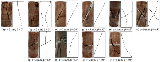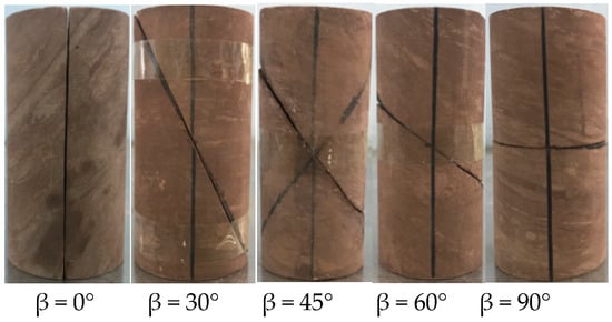 From Figure 9c,d, it can be seen that when β = 30°, the failure mode of grouted rock was sliding along the interface, independent of the fissure thickness. Compared with the intact rock, the interface was still the weak part in the whole sample, and the slurry itself did not appear obviously damaged.