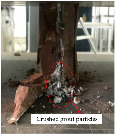 Figure 9 shows the failure mode of the samples under uniaxial compression. From Figure 9a,b, it can be seen that two types of fracture cracks generated, one is the interface of slurry and rock, and the other is the tensile failure crack of the original rock itself. At the same time, the fracture was observed during the test. During the test, it was observed that the slurry was crushed and broken into particles, and only part of the slurry was attached to the rock. When β = 0°, there was no friction between the slurry and the rock, but only the cohesive force. In the process of compression, due to the deformation coordination, the bond between the slurry and the rock first failed. The sample was divided into “two parts” from the interface. The slurry could not bear enough pressure due to the “oblate” shape and it quickly collapsed into granular shape, which is shown in Figure 10. Then, two parts of the rock sample were individually stressed.