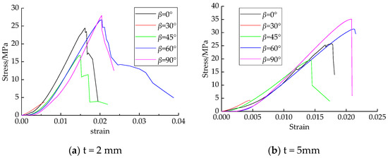 As shown in Figure 15, when the angle between the crack and the load direction was 30°, the stress-strain curve was smooth and nearly linear before peak stress. At the same time, the compressive strength and energy storage capacity of the sample were not significantly related to the thickness of the slurry.