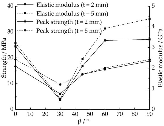 Because of the weak interface, the grouted rock showed anisotropic mechanical properties under uniaxial compression. As shown in Table 1, with the increase of the crack width, the grouted strength increases, but the peak strain changes little. As shown in Figure 12, with the change of the angle between load direction and crack, the grouted rock mechanics present a U-shaped change similar to anisotropic rock mass. When β = 90°, the strength of reinforced composite, peak strain, and elastic modulus reached maximum. When β = 30°, the strength of reinforced composite, peak strain, and elastic modulus reached minimum.