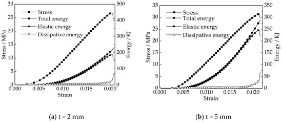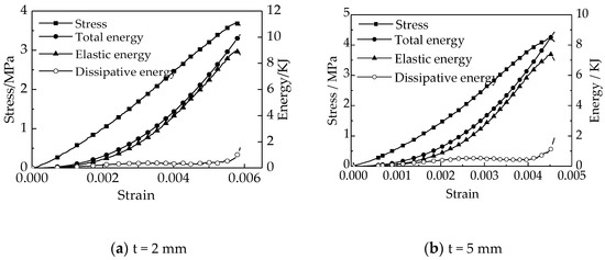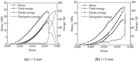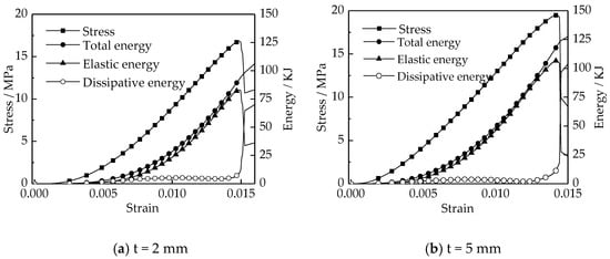 As shown in Figure 14, in the uniaxial compression process, when β = 0° and t = 5 mm, two obvious stress drops appeared during the process of adding stress. Correspondingly, when t = 2 mm, the proportion of energy dissipated in the total energy during compression is larger. When the sample was compressed, the larger the volume ratio of the slurry was, the more obvious the deformation disharmony was, and the interface between the slurry and the rock was more prone to crack and tensile failure. When the slurry and the rock were separated, the rock and the slurry could continue to bear the pressure independently. After the peak stress of the two samples, the elastic energy decreased rapidly and the dissipated energy increased rapidly, which indicated that the brittle failure occurred finally.