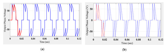 The output waveform of Figure 7b has a non-zero average value in the period of the required output voltage component as its output pulses are asymmetric along the y-axis. It means that the period of the required component is not the same as the period of the output pulses. Power quality analysis with the period of the output pulse leads to incorrect results. To tackle this issue, select the period of the waveform at which the average value of the waveform becomes zero and it is observed to be ‘2π’. The harmonic coefficients depending upon this period are evaluated in Equations (35) and (36).