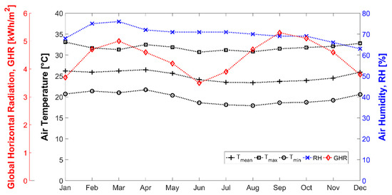 The city of Guayaquil (2°11′21.89′′ S, 79°53′20.64′′ W) is the largest and the most populated city of Ecuador, with an estimated area of 2494 km2 and about 2.72 million people in 2020, based on projections of the National Census Institute (INEC) []. Guayaquil has a tropical climate, corresponding to the Aw group from the Köppen-Geiger classification [], with two well-defined seasons: wet (January–April) and dry (May–December). The climate conditions of Guayaquil are depicted in Figure 1. The monthly average temperatures vary between 23.4 to 26.5 °C. The monthly minimum temperatures are above 18.0 °C, while the monthly maximum temperatures are below 33.2 °C. The relative humidity values are higher during the wet season, while the annual average is about 70%. The monthly average global radiations are between the 3.5 and 5.3 kWh/m2.