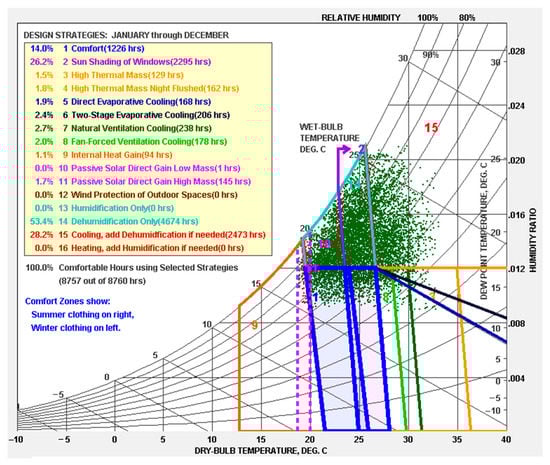 Figure 2 shows the distribution of the annual climate conditions of Guayaquil (temperature and humidity) plotted on the psychrometric chart based on a Typical Meteorological Year (TMY) file. As can be observed, during almost all the year, the city presents high outdoor temperatures and humidity. It means that around 86% of the year people could experiment indoor discomfort. Therefore, efficient air-conditioning systems and/or passive energy saving strategies are required to reduce the energy demand for cooling in these climates. Some strategies suggested by the Climate Consultant v. 6.0 tool [] for the studied climate are dehumidification, sustainable cooling, and solar shading.