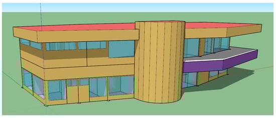 The building under study is the Student Welfare Unit of ESPOL Polytechnic University, whose campus is in Guayaquil, Ecuador (Lat. 2° 8′34.61″ S, Long. 79°58′1.76″ O) (Figure 3). It is a two-story building formed by conventional local building materials, based on masonry construction []. Table 1 summarizes the physical and thermal properties of the building materials that form the studied building envelope. The entire building has a total floor area of about 1086 m2 and a floor to floor height of 4.5 m. This building has a 35% window-to-wall on the north wall, 38% on the south wall, 33% on the east wall, and 23% on the west wall.