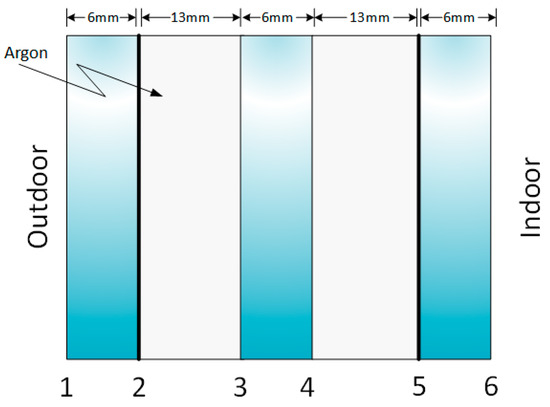 Static windows with triple glazing were considered in the analyses, as shown in Figure 7. This retrofit window has a thickness of 44 mm, where the glasses are in layers 1–2, 3–4 and 5–6. It has two air gaps filled with argon gas (2–3 and 4–5), as well as two low-e coating films (2 and 5). The thickness of each air gap with argon is 13 mm and 6 mm for each glazing. These retrofit windows were modeled in all façades. We proposed windows with lower thermal transmittance values (U-value = 0.785 W/m2-K) to reduce the solar gains of the building, while admitting the entrance of daylight into the indoor spaces (visible light transmittance, τ = 0.66), with a low solar heat gain coefficient (SHGC = 0.474) to avoid overheating. Single pane windows, which are common in the façades of Guayaquil’s buildings, are responsible for increasing the energy demand for cooling due to the higher solar gains. Poor window design will result in significant impacts on thermal and visual comfort and increased energy demand for cooling, and consequently, these will increase energy bills and CO2 emissions.