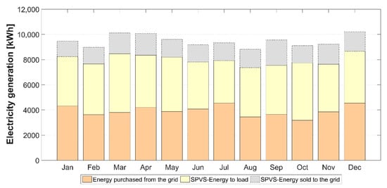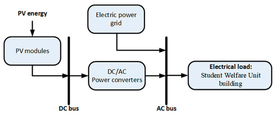 The SPVS aims to reduce the use of the building’s electrical energy from the electric power grid. In the implementation of a SPVS, its investment costs could be much higher than the execution of the other energy saving measures in the building, depending mainly on its size []. In the simulation it is assumed that the surfaces of the PV modules are facing north with a tilt angle similar to the latitude of the site. These last conditions are ideal for extracting the most significant PV energy in SPVSs, located in the southern hemisphere []. DC/AC power converters sends the power generated by the PV panels to the electric power grid, which can operate in parallel to the grid without any inconvenience.