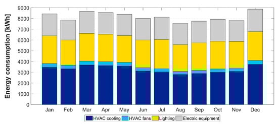Figure 9 shows the estimated monthly energy consumption by end-use. As can be observed, the energy consumption exhibited a seasonal behavior being higher during the months of the wet season and lower during the months of the dry season. This is an expected result since outdoor temperatures during the wet season are higher causing heat gains through the envelope and through infiltration to be more significant than during the dry season.