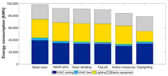 Figure 10 shows the results from the simulations of the energy saving scenarios proposed for the case study. We analyzed the savings strategies in the figure separately. As can be seen, daylighting control strategy had a highest impact on the total energy consumption in comparison with the other studied strategies. It provided a higher reduction in the annual building consumption by decreasing the energy for lighting in 42% compared with the base case. This strategy exhibited a EUI of 72.09 kWh/m2-year. Next, active measures were in second place, providing the highest reduction in energy for HVAC systems and equipment. This is an expected result since active measures directly increased the energy efficiency of the HVAC systems, and also, the replacement of obsolete equipment with their ENERGY STAR equivalent reduced the final energy consumption for equipment in 15%, which can increase if it is applied to other type of buildings such as offices. The resultant EUI of this strategy was 77.07 kWh/m2-year. The other saving strategies showed similar percentages of reduction. The main reason why the daylighting strategy had the highest impact among all strategies is due to the exploitation of daylight in the lighting of the building areas. This contribution of daylight to artificial lighting reduces energy consumption considerably compared to the case where there were not dimmable control systems on the light fixtures. Also, the application of all strategies reduces the energy demand for cooling of the building so that there was a reduction in cooling compared to the base case. Likewise, there was a slight reduction in the use of HVAC fans. These results help to estimate how much electrical energy can be saved by implementing these five strategies.