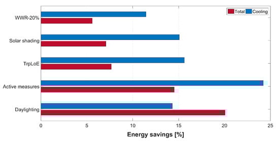 Figure 11 shows the energy saving percentages and the impact of each energy saving strategy on the total building electricity consumption and cooling. As can be observed, WWR-20% showed the smallest reduction in the annual total energy consumption (only 5.6%) but provided a reduction of about 12% in cooling loads. The solar shading and TrpLoE strategies showed reductions in energy for cooling of around 15–16%. The implementation of the WWR and Daylighting strategies should be carefully analyzed in building modeling. This is because while window reduction also reduces internal heat gains, this measure primarily affects the input of daylight and natural ventilation. As can be seen, the daylighting strategy showed a reduction of 20%, being the one that provided more savings in annual energy consumption. Despite daylighting controls decrease the energy for cooling in 14.3%, active measures provided a higher saving in cooling load of about 24.2%. In the case of the building under study, the daylighting strategy would be the ideal choice (between the two strategies mentioned) that would represent a considerable energy savings, in this particular case in electricity, and at the same time, a decrease in the energy bills.