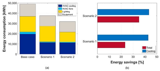 In this section, we simulated two scenarios consisting of two groups of strategies. Scenario 1 consists of the application of solar shading, TrpLoE and active measures, while Scenario 2 consists of the application of daylighting, TrpLoE and active measures in the building model. Results from the simulations of these scenarios can be observed in Figure 12. In the Figure 12a, scenario 1 showed an annual energy consumption of 75,203 kWh (EUI = 69.22 kWh/m2-year) and scenario 2 of 63,713 kWh (EUI = 58.64 kWh/m2-year). Figure 12b showed the percentage savings in total energy consumption and in cooling in the modeling of the two scenarios. Scenario 1 reduced total energy consumption by 35% and scenario 2 by 23% compared to the base case. The impact of both scenarios on building cooling is about 43%.