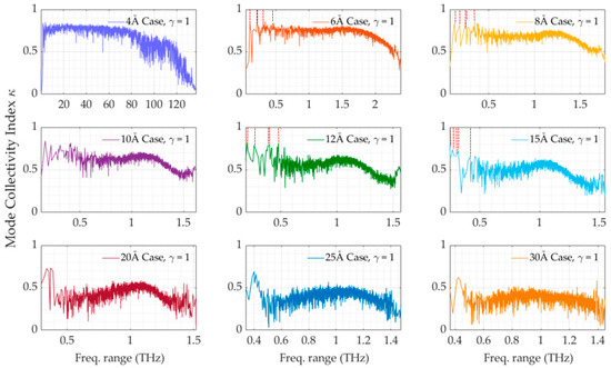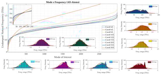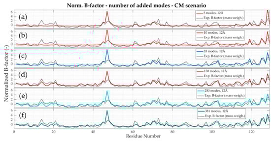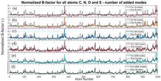 - in the region 750–1000, nodes 991 and 992 present a substantial peak in all cases that go beyond the top of the chart. In that region, a dent extends outside the globular body region, making it similar to a cantilever beam attached to the main structure. This is commonly associated with the first natural mode of numerical solutions and it has high participation in many modes. At first sight, this solution does not present a real behavior according to the experimental B-factors. It is possible that damping related to the surrounding environment may play a role, leading to this discrepancy.