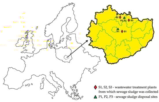 Sewage sludge (S1, S2, S3) was collected from wastewater treatment plants located in the Świętokrzyskie Voivodeship (Table 3). According to the proximity principle, locations for natural sewage sludge disposal sites (P1, P2, P3) were selected as close as possible to the wastewater treatment plants (Figure 1). For S2 and S3, the same location of sludge utilisation was chosen due to the location of these sewage treatment plants. The characteristics of the soils in the accepted locations are presented in Table 4 and Table 5. The sorption properties of the soils are arranged according to their type. A poor sorption complex is characterised by sandy soils, while organic soils have a particularly high sorption capacity. Linde considers that the organic substance in an acidic environment is a more active sorbent for heavy metals than most mineral compounds [25]. Soils have an acidic pH in the range of 4.1 to 4.5. A low pH affects the increased mobility of cadmium and copper. An acidic reaction, a low humus content, and a poor sorption capacity influence increased lead migration. The sorption of zinc depends on the reaction and the granulometric composition. It forms a permanent bond with the soil organic substance, which results in its accumulation. The content of organic substances and the low pH level of the soil boost zinc migration in the soil. The zinc content is high in the analysed soil; however, these are typical values characteristic of Polish soils. Nickel is strongly linked to the organic substance, and its solubility increases with acidity. Due to the susceptibility of nickel to the organic substance, its high mobility is maintained in many soils, even under alkaline conditions [26].