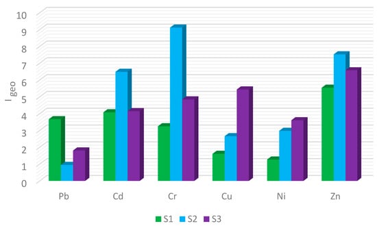 The classification of the heavy metals Igeo is: < 0—no pollution; 0–1—no pollution, moderate pollution; 1–2—moderate pollution; 2–3—moderate or high pollution; 3–4—high pollution; 4–5—high or very high pollution; >5—very high pollution [37].