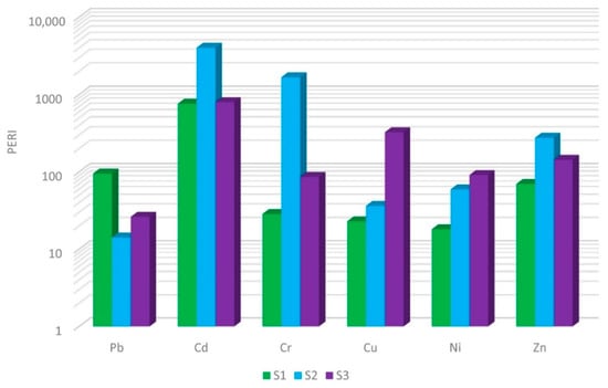 The values of the PERI indicate that the main element in the heavy metal group causing a very high PERI value in all three sewage sludges is cadmium (Figure 3). Chromium of S2 and copper of S3 also showed very high potential environmental risk values. Zinc from S1 showed a moderate level of risk, and high for the other two. The main factor distinguishing the potential environmental risk indicator from the other indicators is the variation in toxicity levels of each heavy metal. Zinc showed the lowest toxicity factor of 1, which resulted in lower risk values according to the PERI when compared to the Igeo.