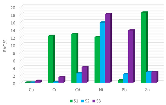 Similar values of the RAC for copper (S1–S3), lead (S1), and zinc (S1) were obtained by Zhang et al. [42]. The RAC with a value indicating a low risk of pollution of the environment with copper is also confirmed by the literature data [39]. Copper is an essential component of many enzymes and proteins, but at high concentrations it can be toxic. Many plants are sensitive to the presence of copper, which can reduce yields. The RAC of nickel for all tested sewage sludge samples, and those presented in [42], belongs to the range indicating a medium risk of contamination of the environment with this metal. On the basis of the RAC of sewage sludge analysed by Tytła [39], and the tested S1–S3 sludge samples, it was discovered that the tested sewage sludge poses a lower risk of a negative influence of nickel on the environment.