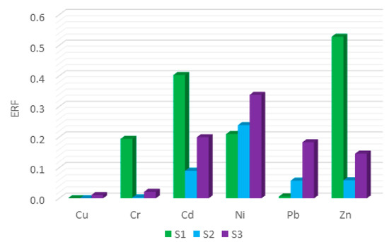 The results of the ERF for SS from the analysed facilities are presented in Figure 5. The analysis of the environmental risk factor showed a low level of contamination for all heavy metals from the three facilities, except for zinc for the S1 and cadmium for S2. Zinc in S1 showed a medium risk of contamination. This was due to its increased content in fractions FI and FII. The literature presents the ERF with a high risk of contamination with zinc [39], and a medium risk for cadmium [39].