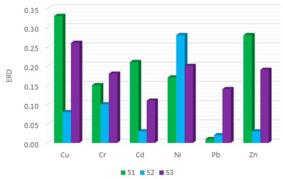 Analysing the results of the environmental risk determinant, it can be concluded that most metals show a low level of risk (Figure 6). Zinc in all three sewage sludge samples showed a low risk of contamination. The highest indicator level for zinc was obtained for S1. However, the ERD indicator did not show a medium risk when compared to the ERF indicator, due to the fact that the ERF indicator treats the FI and FII fractions equally.