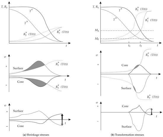 The residual stresses in the finished product are a consequence of the asynchronous thermal shrinkage and phase transformation of the core and the surface regions. During quenching all materials are exerted to shrinkage stresses since the surface always cools faster than the core. Additionally, if phase transformations occur during quenching, transformation stresses ensue as well and superimpose on the aforementioned shrinkage stresses. In order to understand the origin of the residual stresses during quenching and thereby the factors that affect it, a closer look at the generation of these two types of stress is necessary. The top part of Figure 2 shows the cooling curves of the surface and the core of a cylinder during quenching together with the yield stress, of these regions, which depends on the temperature and hence on process time and is assumed to be the same for compression and tension. For simplicity, only the longitudinal stress component is shown, although criteria for plastic flow also consider the tangential and radial components [14,15,16].