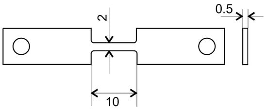 The yield stress of individual phases are essential in modeling the residual stresses as described in Section 1.1. The tensile tests were carried out in a quenching and deformation dilatometer, Dil805 A/D/T from Baehr Thermoanalyse (TA Instruments). The flat specimens used for the tensile tests had a geometry as shown in Figure 3. The temperatures at which the phases were tested were chosen according to the temperatures the individual phases experience during the Tempcore™ process. As shown in Figure 1, the martensite that is generated during the initial quenching step sustains from 200 up to 600 in the following tempering step. The austenite in the core experiences slow cooling and would start transforming at ; hence, it was tested in the temperature regime above and slightly below [2,19,23].