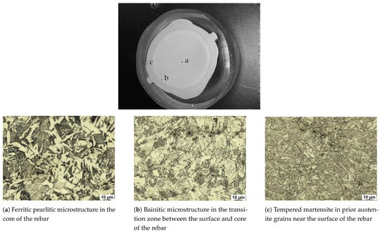 Microstructures observed in the cross-section of the rebar ranging from slowly cooled ferrite to tempered martensite.