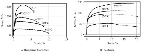 The stress–strain curves as a function of temperature are shown in Figure 6. The martensite specimens were deformed up to fracture (Figure 6a), whereas for the austenite samples the elongation at fracture could not be determined since it is beyond the limit of admissible elongations of the displacement sensor of the dilatometer. Testing austenite at 700 did not result in reliable data, since it was not possible to avoid its transformation into ferrite and pearlite. A higher strain rate of 0.05 during the tensile test was also tried to shorten the testing time, but it had no effect as the recorded stress–strain curve was very similar to the one shown in Figure 6b; therefore, the decomposition of austenite could not be avoided since it occurs within 5 s. The yield stress and the ultimate tensile strength from each curve is listed in Table 3. The temperature-dependent Young’s moduli determined using the resonance frequency measurements, shown in Figure 7, were utilized in order to deduce the from the stress–strain curves.