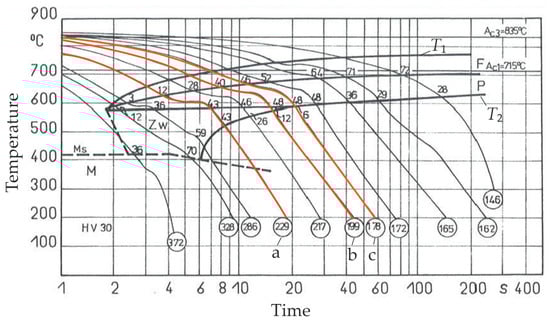 The continuous cooling transformation (CCT) diagram for the particular alloy is indispensable for studying its transformation characteristics. The diagram shown in Figure 8 is taken from literature [42] and published here with the authors’ permission. The chemical composition of the alloy of the diagram is compared to the rebar composition in Table 4. It should be noted that both the carbon content of the tested rebars (0.17% to 0.23% wt% (cf. Table 1)) and the content of Mn and Si matched the composition of the CCT-steel quite well. Hence, it is reasonable to assure that depicted CCT diagram is relevant for the rebar steel studied in this work. Furthermore, three heating and cooling schedules for the rebar steel were realized with different cooling rates and were compared with the CCT diagram as shown in Table 5. The hardness of the specimens from this heat treatment corresponding to the ones in the CCT diagram are shown in Figure 8 as a, b, and c. During heating, the temperatures and agreed with those noted in the diagram 715 and 835 , respectively. During cooling, the starting and finishing temperatures of the transformations, and , and the hardness values at the end of the transformations showed good agreement with the values given in the CCT diagram.