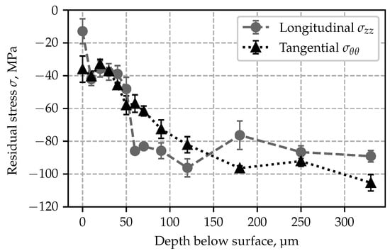 The near-surface residual stresses in the rebar were measured at the location between two transverse non-parallel ribs and are shown in Figure 9. Both the longitudinal (axial) and tangential stresses are compressive, and they vary in magnitude almost in a linear fashion from 10 MPa on the surface to 90 MPa up to a depth of 100 . Beyond this depth the magnitude remains the same for up to a depth of about 300 . Compressive stresses of about 50 MPa near the surface of the rebar were also observed by Rocha et al. [10], but were documented only to a depth of 50 . The stresses shown in Figure 9 are compressive and much lower than the tensile yield strength of tempered martensite at room temperature, which is the predominant microstructure constituent near the surface of the rebar. No stress reversal of compressive to tensile stresses was observed in the studied depth range. The measurement uncertainty depicted is evaluated in the course of the linear regression analysis of the lattice spacing to the values according to the -method [36,43].