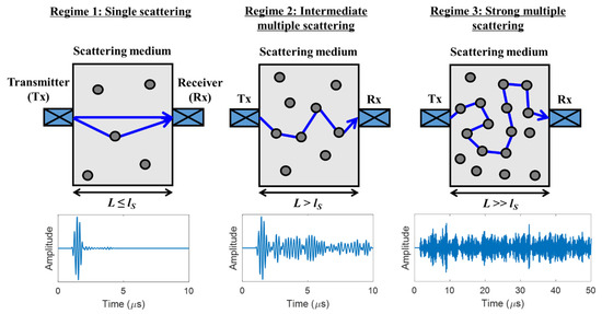 Air with fine dust can be considered a discrete random medium where fine dust particles are randomly distributed within a background medium (i.e., air). When acoustic waves propagate through a discrete random medium, they interact with scatterers. The wave propagation lies in a different regime depending on the wave propagating distance (L) and scattering mean free path (lS), as illustrated in Figure 1. Here, lS is the characteristic length of the exponential decay of a coherent wave that propagates in its initial direction after taking ensemble averaging over multiple realizations of disorder [16].