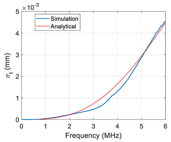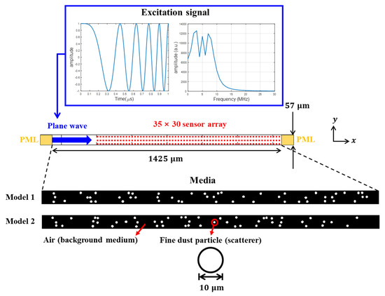 The overall structure of the numerical simulation model is illustrated in Figure 3 and the numerical simulation parameters are summarized in Table 1. The simulated media represent 1425 μm × 57 μm air spaces where 10 μm fine dust particles were randomly spread out with different volume fractions (1, 2, 5, 10, and 15%). For each particle volume fraction case, two models with different particle placements were simulated. A spatially random distribution of dust particles is assumed to represent the air-particle system in reality. Perfectly matched layers (PMLs) [27] were added at the two ends of the simulation space to eliminate boundary reflections, as shown in Figure 3. PMLs were not added to the two edges parallel to the wave propagation path to model a plane wave incidence condition. Plane acoustic waves were generated with an excitation signal that was a linear chirp, across 0 to 10 MHz (see Figure 3), applied to the left end of the air space. We chose the frequency band (0–10 MHz) that gives a ka value below 1 to use the simplified analytical solution of the total scattering cross-section (Equation (13)). The corresponding acoustic wavefields were captured by a 35 × 30 sensor array at each model, as shown in Figure 3. Here, each of the 35 acoustic wave signals along the x-axis represented a signal set (1-D scan data) for a single realization . To obtain an ensemble-averaged signal set , multiple realizations were needed. For each volume fraction case with two medium models, 60 acoustic wave signal sets (30 signal sets per model) were obtained to give the number of ensemble averaging (M) of 60. Two separate models, each providing 35 signal sets, were simulated, instead of a unified model providing 60 signal sets, for each volume fraction case due to limited computation power.