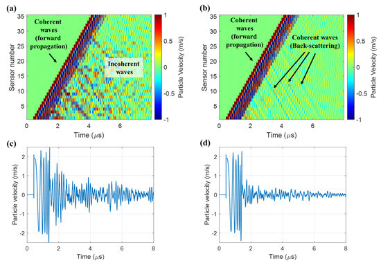 Acoustic wavefields (represented by the particle velocity) for the 1% volume fraction case for a single realization and the ensemble-averaged wavefield with 60 realizations are shown in Figure 4a,b, respectively. Figure 4a represents and Figure 4b denotes . In these figures, wave rays with a positive slope indicate forward-propagating wave components and those with a negative slope indicate backward-propagating wave components. To clearly visualize incoherent wave components, the amplitude range (particle velocity) was limited to −1 to 1 m/s in Figure 4a,b. The single realization case (Figure 4a) displays a mixture of coherent forward-propagating waves and incoherent noise-like wave components that are set up by the network of fine dust particles. For the ensemble-average case (Figure 4b), the incoherent wave components that are distinct in Figure 4a are suppressed. Coherent forward-propagating waves are dominant in the ensemble-averaged wavefield and coherent back-scattering components are also observed. Acoustic wave signals at the first sensor position for the single realization and ensemble-average cases are depicted in Figure 4c,d, respectively. The two signals also demonstrate incoherent wave suppression by ensemble averaging.