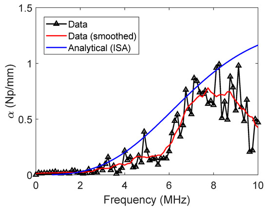 The coherent wave attenuation for the 1% volume fraction, computed using the coherent wavefield data presented in Figure 4b, is illustrated in Figure 5. As a reference, the ISA-based analytical attenuation computed by multiplying the analytical total scattering cross-section and the known number density value of 123 is also displayed. Overall, the coherent wave attenuation obtained using the simulation wavefield data exhibits good agreement with the analytical attenuation in the increasing trend over frequencies. However, as the frequency increases, the deviation between the two attenuation curves (data and analytical) becomes more distinct, revealing the possibility of number density estimation error.
