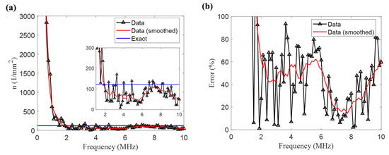 The number density values computed by the proposed approach are presented in Figure 7a. The exact number density value (123) is also indicated in the figure. Except for the low-frequency region (below 1 MHz), the estimated number density values are close to the exact number density with some variation. The mean and standard deviation of the estimated number density values in the frequency region between 1 MHz and 10 MHz are 99.18 and 91.83, respectively. The number density estimation error over the frequency region is displayed in Figure 7b. The estimation error varies with frequency. The mean of the estimation error within 1–10 MHz was 43.4%, and the minimum error was 1.19% at 1.88 MHz. Considering that the number density values were back-calculated from complicated wavefield data from a discrete random medium, the obtained number density values and the error level seem to be reasonable.