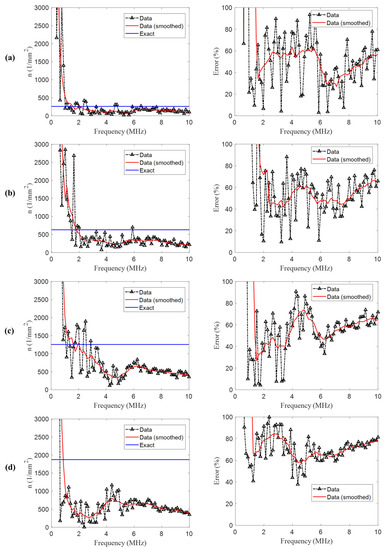 To investigate the effects of particle volume fraction on the number density estimation accuracy, numerical simulation data for different particle volume fractions were used. Figure 8a–d present the number density estimation results (left) and estimation error (right) for volume fractions of 2%, 5%, 10%, and 15%, respectively. Along with Figure 7 (1% volume fraction), Figure 8 indicates that the estimated number density values over the frequency region of interest (1–10 MHz) become more deviant from the exact number density values as the volume fraction increases. In general, a higher estimation error is observed as the particle volume fraction increases. The higher errors observed in the cases with higher volume fractions are mainly because the scattering attenuation computed by the ISA is valid within lower volume fractions of scatterers [28].